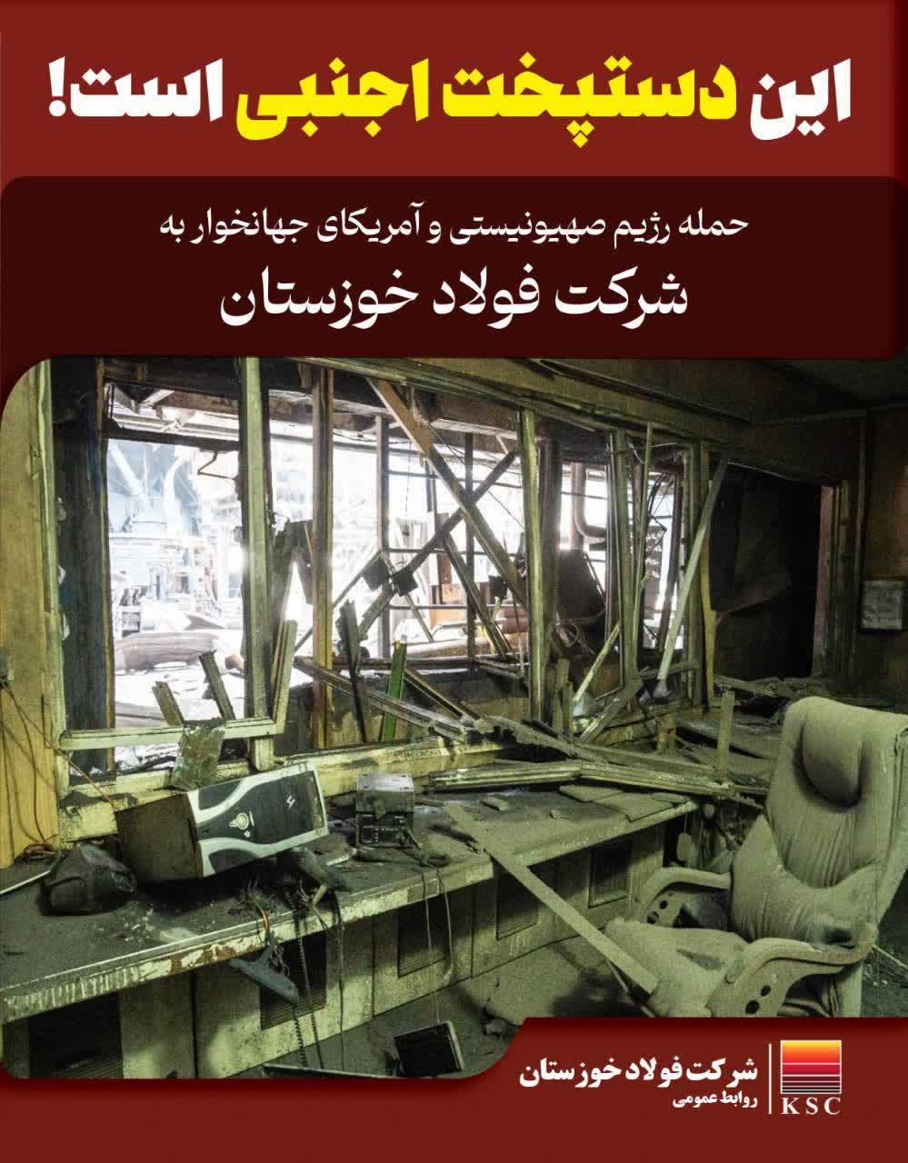 ۹بسم الله الرحمن الرحیم پیرو اطلاعیه قبلی در خصوص حمله‌ی دشمن آمریکایی‌صهیونیستی به اطلاع آحاد ملت شریف ایران اسلامی می‌رساند ؛ طبق اخرین بررسی های صورت گرفته، به دنبال حمله‌ دشمن آمریکایی‌صهیونیستی به شرکت فولاد خوزستان کارخانجات احیا ۲، مگامدول زمزم۳ و فولادسازی دچار اصابت شده که در پی آن خطوط تولید شرکت متوقف گردیده […]